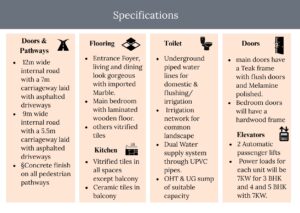 Kitchens are designed with modular setups, reticulated gas pipelines, and provisions for electrical and water points. Bathrooms include premium fixtures, granite counters, exhaust provisions, and safety features that prioritize resident comfort. The project also includes rainwater harvesting, intercom connectivity, high-speed elevators, and DG backup for uninterrupted power supply.