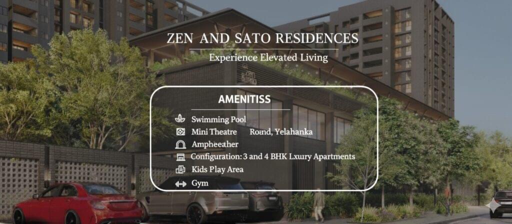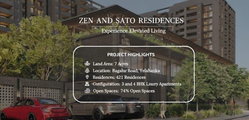 The project is built across 7 acres of land at Bagalur Main Road, Yelahanka which is the heart of North Bangalore. The configurations are 3 and 4 BHK luxury apartments with 412 residences, along with 216Sq.Ft living balconies. This configuration provides 74% open spaces which helps them to create community engagement and social behviour. The development offers lots of amenities which easily get attracted by the residents who looks for modern environment. The amenities such as gymnasium, multi propose courts, swimming pool, and community hall and so on. Zen and Sato emerge as a unique development with its advantage in location, amenities, architectural excellence, quality materials, and on time delivery.