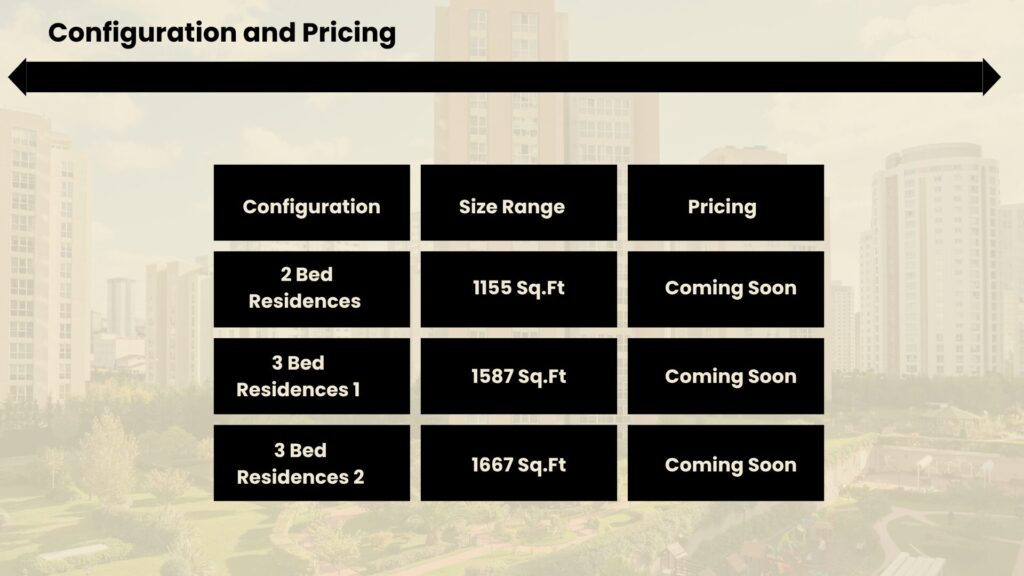 The 3 Bed Residences provide generous living spaces, multiple bedrooms with attached bathrooms, and large terraces or balconies. The floor plans are crafted to balance functionality with elegance, offering residents a luxurious, convenient lifestyle.