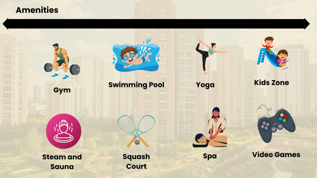 Health and wellness are integral to the development, with a fully equipped gym, yoga zones, jogging tracks, and landscaped gardens. Children have dedicated play areas, sports courts, and recreational spaces to encourage active lifestyles.