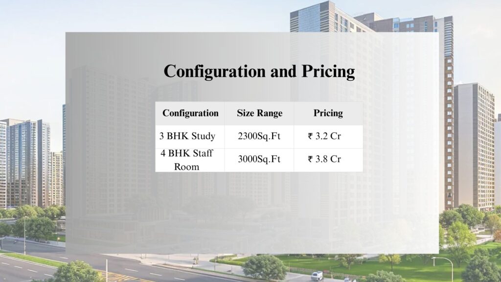 The project features 3 BHK with Study and 4 BHK + Staff Room configurations, starting at ₹3.2 Cr onwards, catering to families seeking both comfort and a sophisticated lifestyle. Every home is designed with spacious layouts, cross-ventilation, and abundant natural light, creating a harmonious living experience.